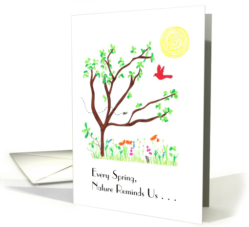 | Artist Notes: | A gentle and colorful nature scene depicts a tree budding new leaves, a red bird flying, a bee buzzing, a small grey mouse peeping out from grasses, and a variety of fresh flowers with blue, orange and pink blossoms. The front reads, 'Every Spring, Nature Reminds Us . . .' in an elegant retro Parisian font. The inside reads ' . . . that we can all enjoy a fresh start!' |