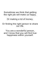 | Inside: | Sometimes we think that getting the right job will make us happy. Or making a lot of money. Or finding the right person to share our life. You are a wonderful person, and I know that you will find true happiness within yourself. |