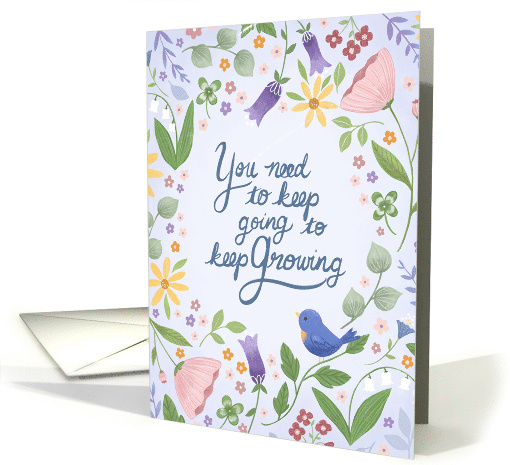 An illustrated card covered in delicate and colorful flowers with a sweet blue bird perched near the bottom. In the center of the card in blue hand lettering are the words "You need to keep going to keep growing". A cheery design to send along a personal message to friend or family member.