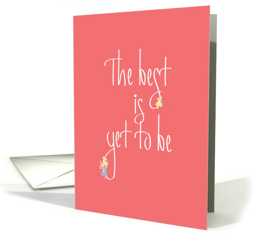 | Artist Notes: | This card is beautiful way to share meaningful encouragement with someone special who is in need of some. The background of the card is a rich salmon color, with the message "The best is yet to be", elegantly hand lettered, in white. Flowers of yellow, light pink and blue are interwoven into some of the lettering, adding further joy and color to the card. The card's inside wording is "You have a wonderful future ahead of you." |