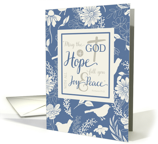 Inspirational encouragement card with blue repeat pattern background of birds and blooms, and a typography styled bible verse from Romans 15:13, "...may the God of Hope fill you with all Joy and Peace." Designed by Robin in honor of a special friend with breast cancer. Part of Rycky Creations' "HOPE" series of cards where 100% of earned commissions are donated to cancer research.