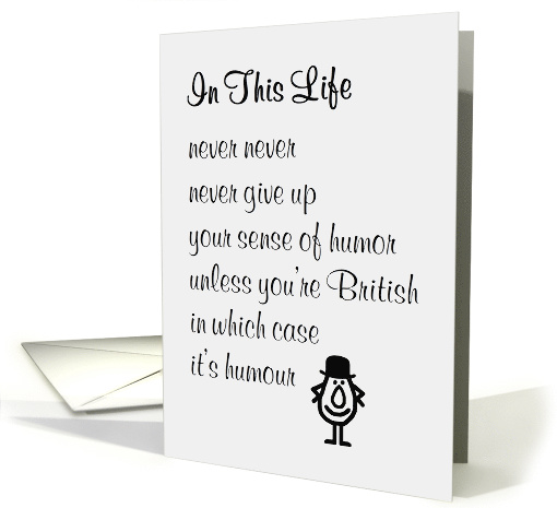 | Artist Notes: | A funny encouragement card for a friend, featuring a bad poem and illustration, about how important it is to keep in good humor (and humour). Our character, tillie, is wearing a bowler hat. He is also wearing a broad smile and appears to be in good humor (as well as, humour). |