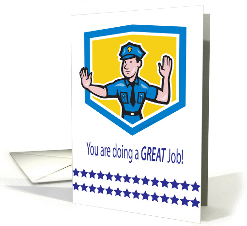 | Artist Notes: | Give that hard working policeman an encouragement card. The cover features a cartoon policeman and shield, courtesy of The Graphics Factory, a white background, dark blue stars, and a headline in dark blue. The inside message may be changed, if you wish. ©Gail Pepin |