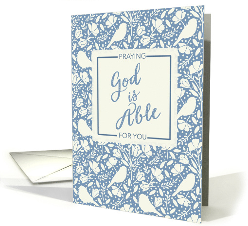An uplifting faith-based card featuring a repeating pattern background of birds and flowers and handwritten "God is Able" inside a "Praying for you" box.