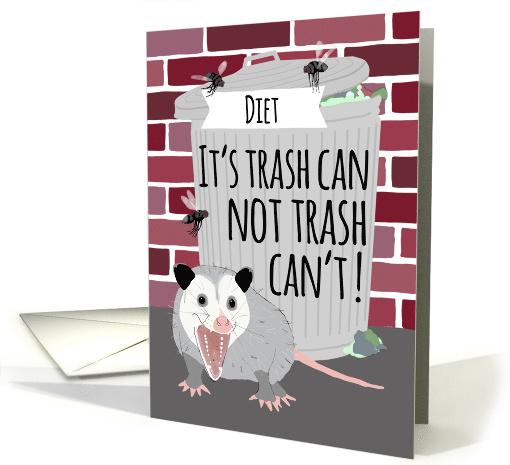 | Artist Notes: | A really fun encouragement card to send to a friend or loved one who is starting a diet. This charming card features an optimistic opossum, a trash can and some flies. |
