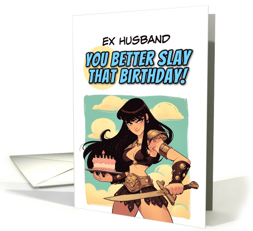 | Artist Notes: | A fierce warrior princess with a sword and a birthday cake is telling you it's time for celebrations. "Ex husband you better slay that birthday!" A fun card for your amazing ex husband who's putting another candle on their cake. |