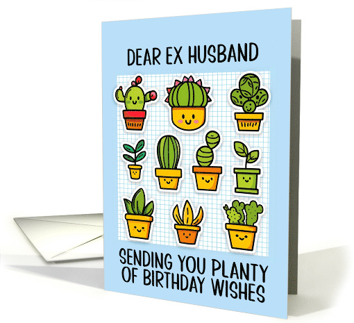 | Artist Notes: | A whole bunch of kawaii cactus and succulent plants in pots on a light blue background with the text "dear ex husband sending you planty of birthday wishes". A wonderful birthday card to send to your special plant loving ex husband |