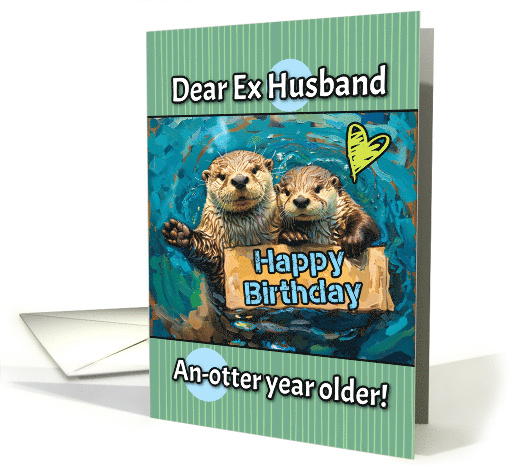 | Artist Notes: | A cute otter duo floating on their backs in the water are holding up a sign that spells HAPPY BIRTHDAY on a teal background with a stripe pattern and the text "dear ex husband An-otter year older!" A fun pun card to send to your wonderful ex husband for their special day |