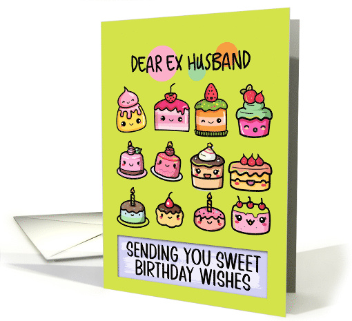 | Artist Notes: | Lots of sweet smiling cartoon birthday cakes - in a clean kawaii style with bold lines - with candles or fruit on top on a lime green background and the text "dear ex husband sending you sweet birthday wishes". The perfect card to send to your amazing ex husband for their birthday. |