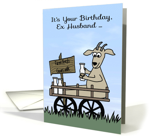 | Artist Notes: | A humorous card addressed to ex-husband highlighting an adorable goat sitting in a cart with its legs stretched out selling farm-fresh goat's milk. The background is a partly cloudy sky accented with black text. The goat is a member of the animal family Bovidae and the subfamily Caprinae, meaning it is closely related to the sheep. Original design by Laurie Schneider, elements by Scrappin Doodles. |