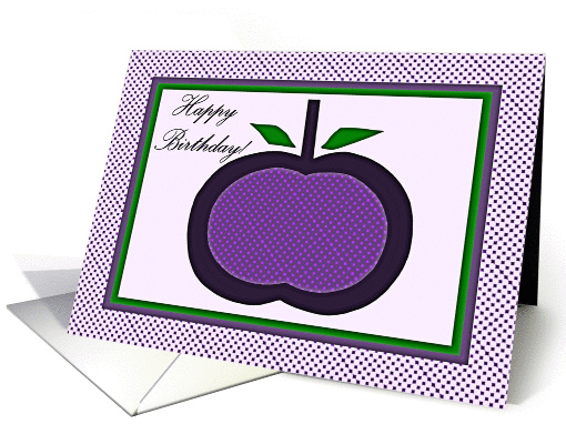 | Artist Notes: | This artistic collage shows a minimalistic violet and purple apple with green leaves on a pale rose background. The card has this image, a purple polka dot border with line accents, and the expression: "Happy Birthday!" |