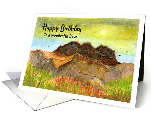 | Artist Notes: | Send this lovely birthday card with a watercolor illustration to a wonderful Boss who enjoys being outside and in nature. It offers a stunning setting, with mountains in the Southwest style, plants, and wildflowers. |