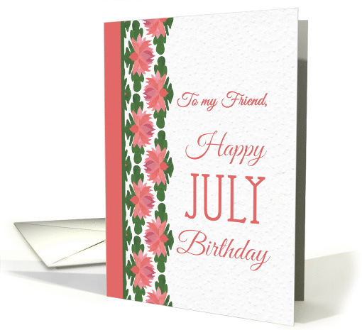 | Artist Notes: | An elegant pink and green July Birthday Card for a Friend, with a border of pink Water Lilies down the left hand side. The front cover greeting, in script lettering that matches the pink of the water lilies, is, 'To my Friend, Happy JULY Birthday' on a white background that gives a textured appearance. You can easily edit or delete the inside message if you wish. |