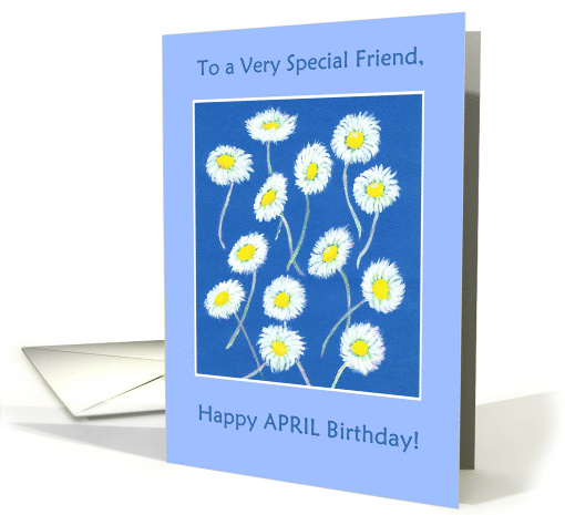 | Artist Notes: | A pretty Birthday Card for a friend's April Birthday, with white daisies, the April birth-month flower, on a blue background, from a hand-painted design by Judy Adamson. The daisies pattern is surrounded by a lighter blue border, with 'To a Very Special Friend,' in darker blue at the top and 'Happy APRIL Birthday' at the bottom. Please feel free to change, add to or delete the inside message if you wish. |