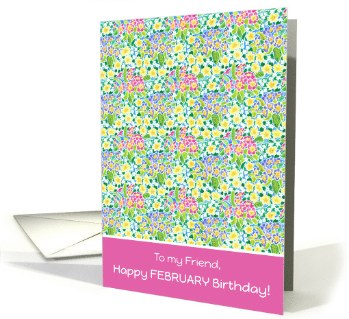 | Artist Notes: | A pretty February Birthday Card for your friend, with a pattern of deep pink, deep blue and yellow primroses, the February Birth-month Flower, from a handpainted design by Judy Adamson. Below the primroses pattern is a matching deep pink area where the greeting, 'To my Friend, Happy FEBBRUARY Birthday!' is written in white lettering. The inside message is just a suggestion and you can easily change or delete it if you wish. |