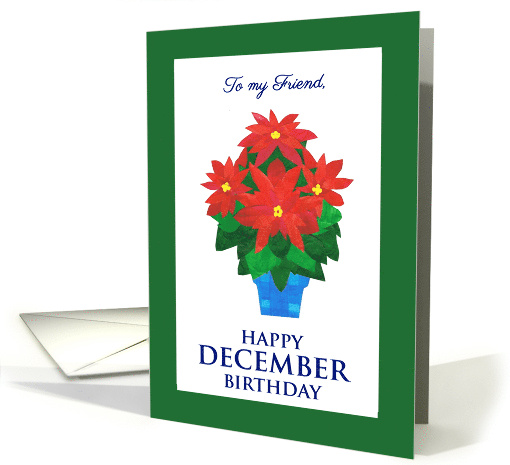 Poinsettias are not just for Christmas; they are also one of the December Birth Month Flowers! So if you're looking for something special, something a bit different, for your friend's birthday, look no further! This Poinsettia is a digital capture of a hand-painted paper collage by Judy Adamson and it is surrounded by a matching dark green frame, while the front cover greeting, in dark blue lettering is, 'To my Friend, HAPPY DECEMBER BIRTHDAY'. It is entirely up to you whether you keep the inside message as you can easily change or delete it.