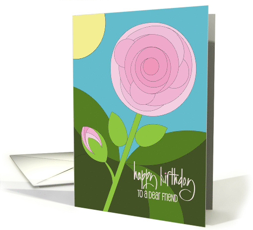 Celebrate your dear friend's June birthday by giving them this lovely pink rose card this year. The rose is the monthly flower for June and this beautiful floral card, with its hand lettered light pink wording of "Happy Birthday to a Dear Friend", makes the card a wonderful way to celebrate your friend's birthday. The rose diagonally crosses the card, with a round sun in the upper left corner. The petals of the pink rose are concentric, darkening as they near the center of the flower. A tiny blossom opens part way up the stem. The inside wording of the card says "Have a wonderful day!"