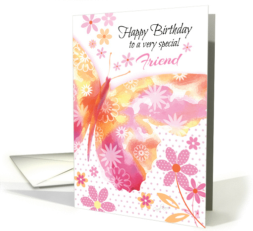 This colourful Happy Birthday card for a special Friend features a large butterfly in gorgeous tones of pink, lemon and orange. The butterfly fills up most of the card and the background is white with pink polka dots and flowers. It is digitally painted from an original drawing.