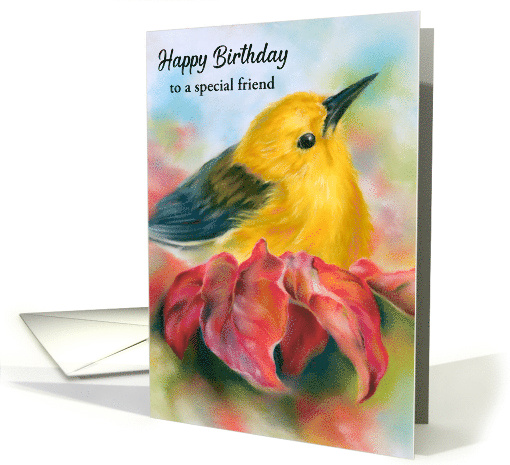 Any friend would appreciate receiving this birthday greeting personalized especially for them. The front is embellished with a small bird created in soft pastel hues of bright yellow and gray perched amid autumn dogwood foliage of red.