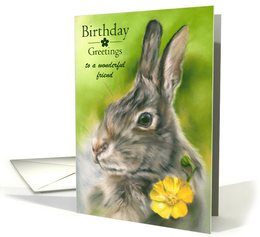 Easily customize the recipient text on the front of this birthday greeting for a friend or for anyone. The design features wildlife art in soft pastel shades depicting a bunny rabbit with gray and brown fur accented by a cheery yellow buttercup blossom and green bud on a verdant meadow like backdrop.