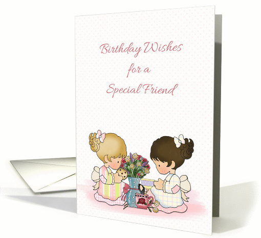A tea party themed birthday greeting for a special friend with two sweet little girls sitting with tea, cookies and a vase of pretty flowers on soft pink and white polka dot background.