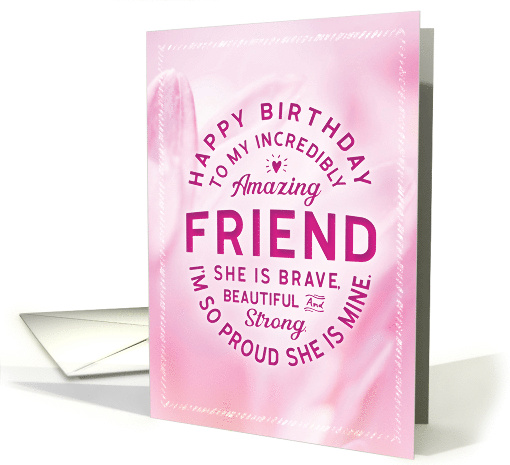 Wish your friend a happy birthday with this unique typography badge style card, featuring the message, "Happy birthday to my incredibly amazing FRIEND. She is brave, beautiful and strong. I'm so proud she's mine." White type appears on red floral background with white frame. Inside can be customized to fit your needs.