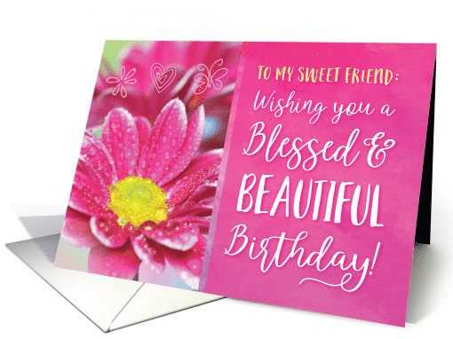 Say happy birthday to your daughter with this unique card featuring the message, "FOR MY SWEET FRIEND: Wishing you a Blessed & BEAUTIFUL Birthday!" Design appears with beautiful pink and yellow flower on left and watercolor texture on right as well as flower, butterfly, and heart accents. Inside can be customized with a message of your choice.