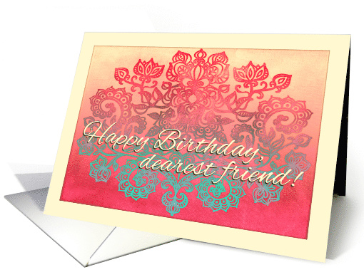 A detailed, hand drawn, floral doodle with an ombre gradient in shades of coral red, peach, cream & turquoise, mint / teal, with subtle canvas & ink textures. Text: Happy Birthday, dearest friend! A beautiful, bright & colorful card to give to someone special on their birthday!