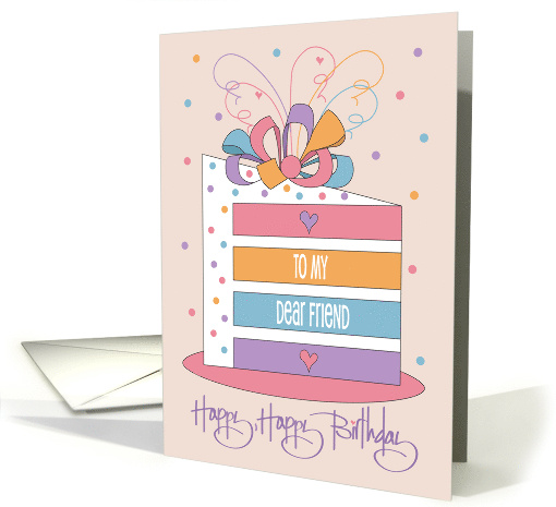 This elegantly joyful and rainbow-colored card for your friend's birthday is a uniquely adorable way for you to wish your friend a Happy Birthday. "Happy, Happy Birthday" is hand lettered across the bottom of the card, right below a four-layer rainbow cake, that is stacked high with layers of pink, orange, blue and lavender. The middle layers of the cake slice have white wording of "To my dear friend" written across them, with pink and lavender hearts on the other two layers accentuating the wording. A colorful looping bow of pink, lavender, blue and orange crowns the cake with the same colors as seen in the cake. Round sprinkles on the frosting and in the air copy the same colors over and over again throughout the creamy-white card! The inside wording of the card says "A rainbow of sweet birthday wishes for you! Wishing you joy and laughter the whole day through, with love!"