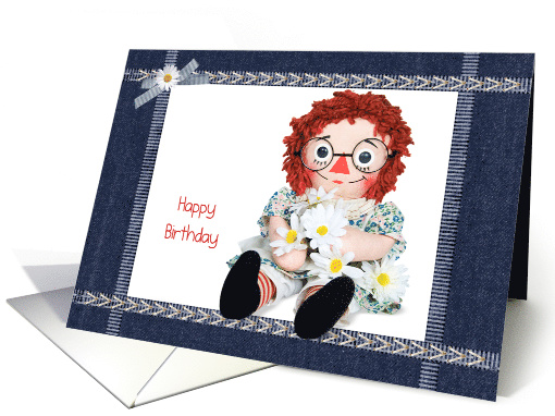 Friend's Birthday old rag doll with daisy bouquet in denim frame