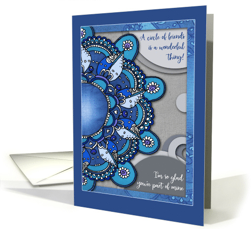 A pretty floral mandala design in shades of blue and gray, with textures and layers of decorative circles in the background. Text reads: "A circle of friends is a wonderful thing! I'm so glad you're part of mine!" Customizable inside text reads: "You are such a great friend to me, I hope you get all the blessings you so richly deserve. Happy Birthday, dear one!" Perfect for a bff on their birthday.