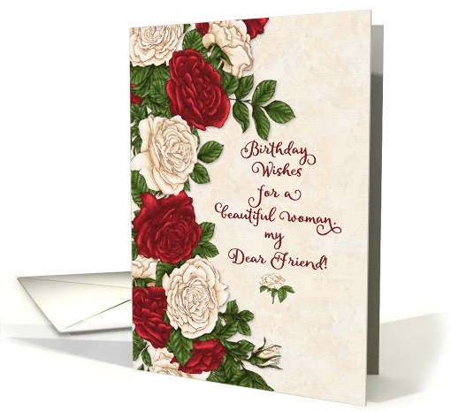 Send pretty Happy Birthday to a Dear Friend greetings with this lovely design featuring red and white roses. The front sentiment gives birthday wishes to a beautiful woman.