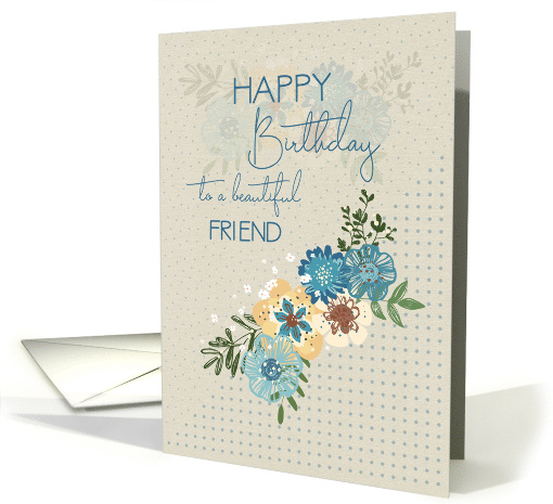 Give your friend lovely birthday wish with this design featuring pretty blue and cream flowers on a background of polka dots.