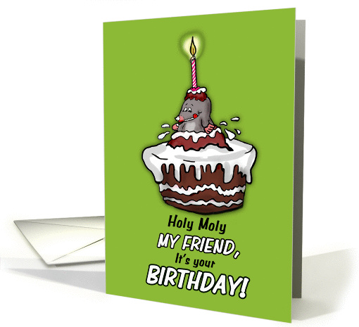 This card shows a cute little whimsical Mole that dug through a birthday cake. He even has the burning birthday candle on his had. This cartoon style card is a funny and humorous way to wish happy birthday.
