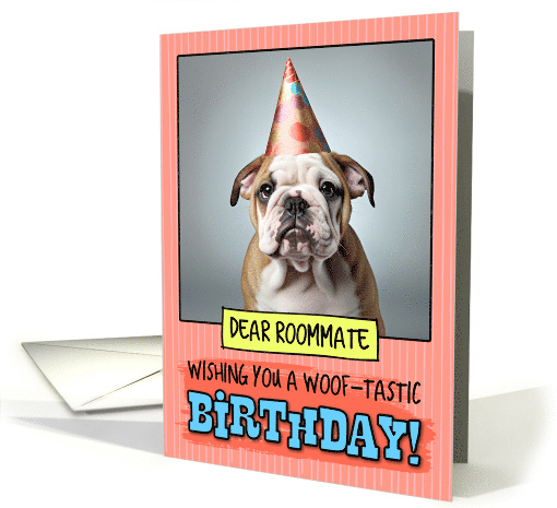 | Artist Notes: | An english bulldog puppy wearing a birthday hat on a salmon-pink background with a stripe pattern with 'dear roommate' in a yellow box and the text "wishing you a woof-tastic birthday!". A fun card to send to your roommate for their birthday. |