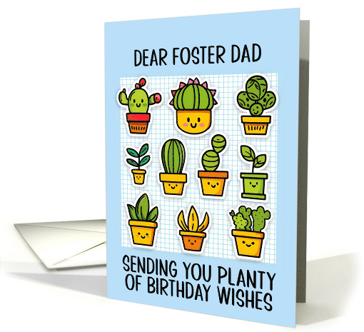 | Artist Notes: | A whole bunch of kawaii cactus and succulent plants in pots on a light blue background with the text "dear foster dad sending you planty of birthday wishes". A wonderful birthday card to send to your special plant loving foster dad |