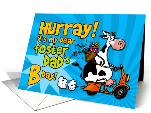 | Artist Notes: | A cute black and white cartoon cow with a birthday present in its backpack riding an orange scooter on a blue striped background with the text "Hurray! it's my dear foster dad's B-Day!" |