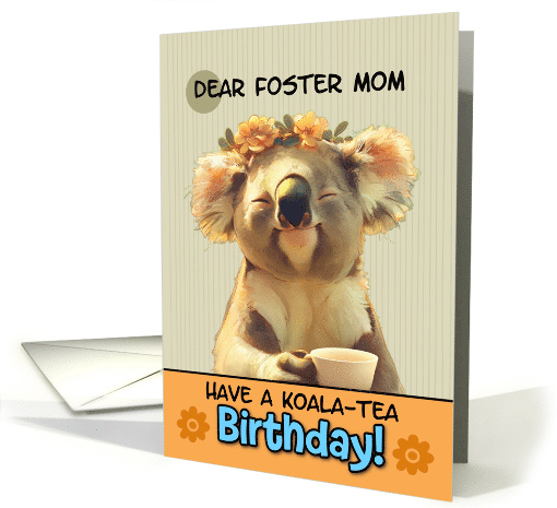 This birthday card features an adorable and whimsical illustration of a koala. The koala is depicted with a content, smiling expression and closed eyes, suggesting a state of blissful relaxation. It's wearing a delicate floral crown of small yellow-orange flowers, adding a touch of cheerfulness to its appearance. The koala is holding a white tea cup, which ties into the pun in the card's message. The background is a soft, striped pattern in a light beige color, giving the card a gentle, warm feel. At the bottom of the image is an orange banner containing the text "HAVE A KOALA-TEA Birthday!" This clever pun combines "koala" with "quality" to create a playful, tea-themed birthday wish.