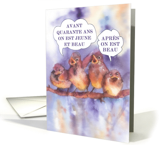 French Birthday card. Translation:"Before one's 40th birthday, one is young and goodlooking. - After 40 one is goodlooking" Wish that special person a happy birthday with this card featuring a watercolor painting of cute chirping sparrows. You can edit text inside card. Custom requests welcome.
