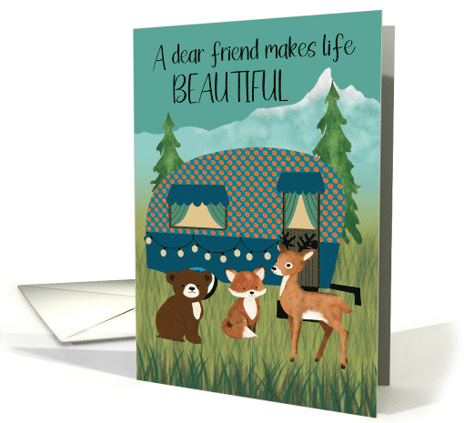 | Artist Notes: | This is a sweet friendship card with baby woodland animals together in a semi-circle. There is a bear, fox and deer in front of a retro camper in the mountainous outdoors. |