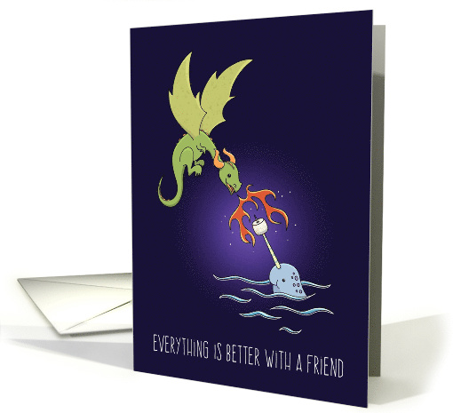 | Artist Notes: | Cute friendship card features dragon in flight, breathing fire on a marshmallow placed on the horn of a narwhal. Let your friend know that when they're around, everything is more enjoyable. |