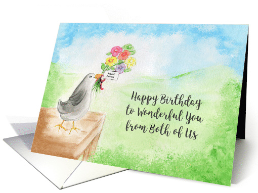 Wish a wonderful someone a birthday that is as wonderful as he or she is with this heartfelt greeting card "from Both of Us" featuring a colorful digitized watercolor scene of a gray bird holding a bouquet of multi-colored flowers in front of a bright background of lush green hills and bright blue sky.