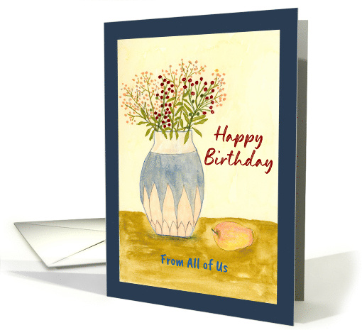 Give a unique member of the group this Happy Birthday card to commemorate their special day. The artwork features a still life painting of a botanical vase and an apple on a table.