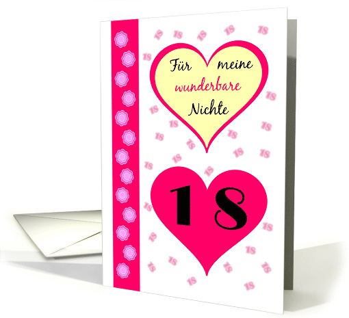 For your niece on her 18th birthday: "Für meine wunderbare Nichte" = "For my wonderful Niece". This card features hearts, flowers and number 18s, all in shades of pink on a white background. The greeting on the front of the card is written on a golden heart edged with deep pink, and there is a second large pink heart carrying the number 18. Inside, the card has the customizable message "Alles Liebe und Gute zum 18. Geburtstag" = "With love and good wishes on your 18th birthday".