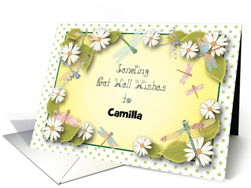 Artist Notes: | Send a custom name get well card with a dragonfly theme to someone under the weather. This will cheer him or her up. The cover features colorful dragonflies, white daisies, green leaves, and a light green polka dot border. The headline is black and there's room for the name at the bottom. The inside message may be changed, if you wish. ©Gail Pepin |