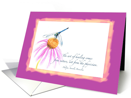 Artist Notes: | An original watercolor and pencil illustration of a dragonfly perched on a purple coneflower. The quote reads "The art of healing comes from nature, not from the physician." The artwork and quote are on a white background, painterly brushstrokes edge the border between art and purple background. Created to be a colorful card for someone is not feeling well emotionally or physically. |