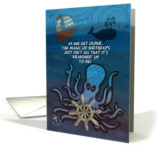 | Artist Notes: | Give someone that is getting older a laugh with this humorous nautical design that features a fantasy underwater scene which includes the mythical Kraken monster octopus with a boat and whale floating overhead, an anchor, and a ship's wheel. Background is a deep blue with waves and an under the ocean feel. Sentiment is a play on words that is sure to bring a smile. |
