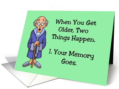 Getting Older Birthday card with a cartoon of an old man. The words on a green background say, When you get older, two things happen. 1. Your memory goes. Inside says Happy Birthday. (There is no number two because they already forgot it.)
