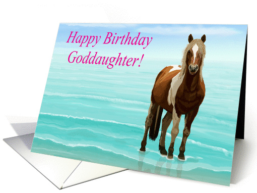 This birthday card for goddaughter features a striking paint Chincoteague pony standing at the water's edge.