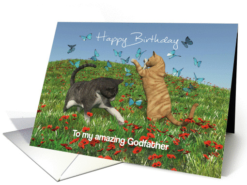 | Artist Notes: | Two cats are playing with butterflies in a colorful field with a lot of beautiful red poppies. Ideal for the birthday of your cat loving Godfather. Inside there is a text which you can customize to something very personal. |